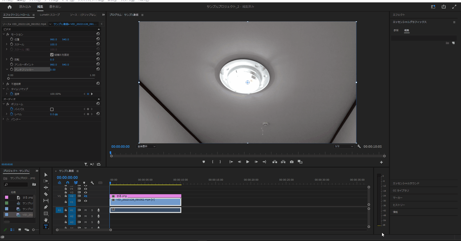4-1.タイムラインに拡大縮小させたいアイテムを置いた状態でエフェクトコントロールの「アンカーポイント」を左上に持ってきます。