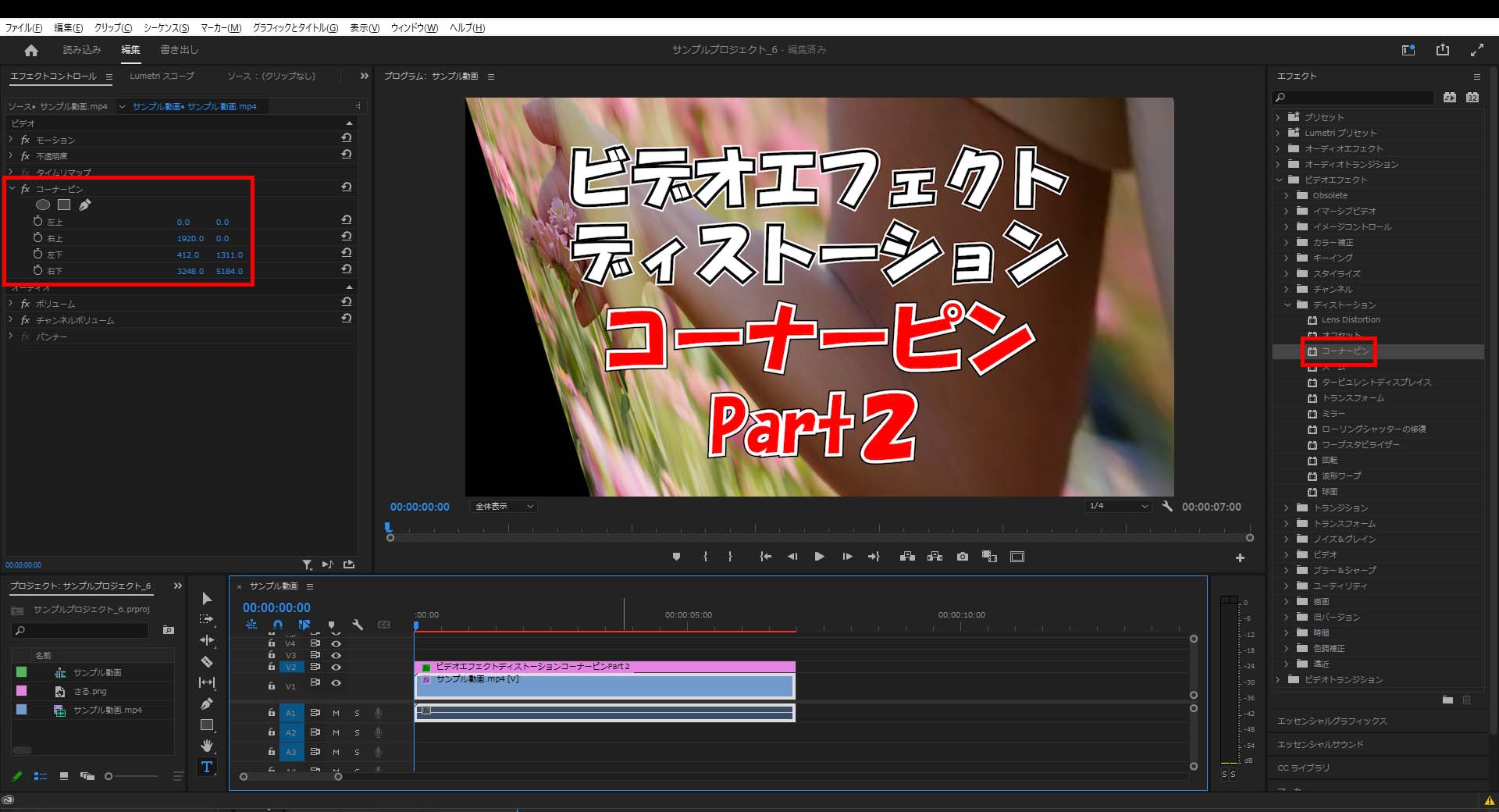 「コーナーピン」は「ビデオエフェクト」の「ディストーション」の中にあります。